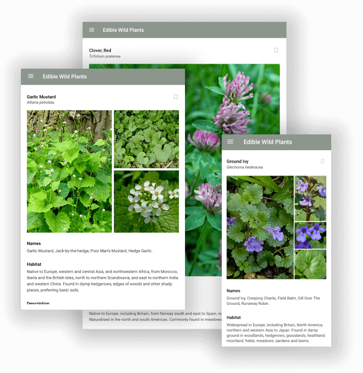 Our free Edible Wild Plants app contains an in-app database (no internet connection needed) with over 40 commonly found wild plants that you can eat. With easy swipe navigation, user bookmarks, and a complete linked index of common and botanical names, each plant comes with images, a botanical description, where they can be found, and which parts of the plant are edible. We've also included our plant edibility testing guide for our survivalist friends.